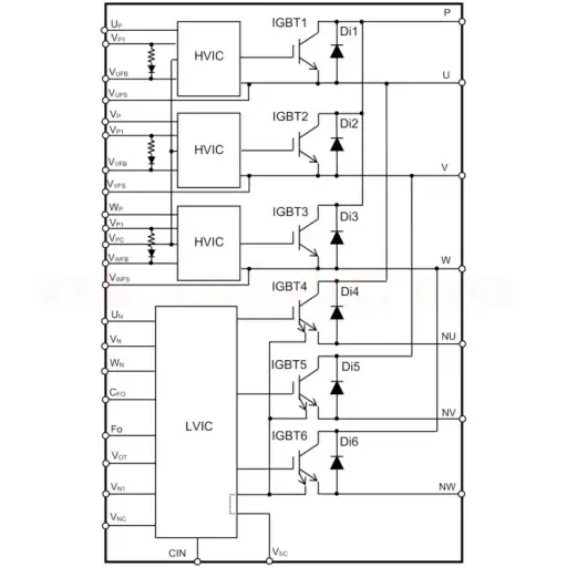 – Direct control through HVIC equipped with drive circuit, protection circuit, and level conversion circuit, based on input signals from CPU and microcomputer